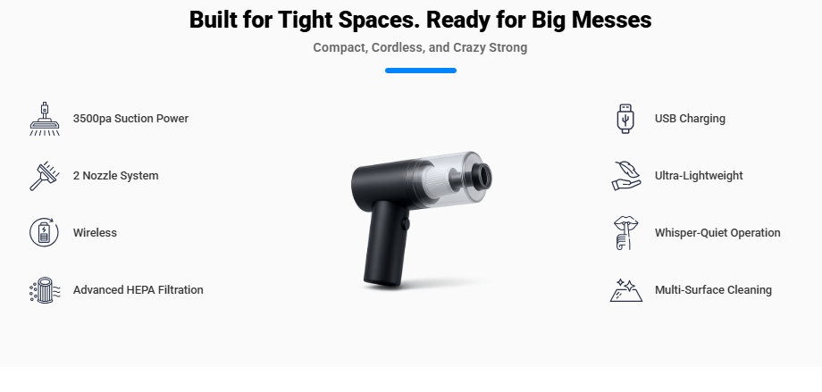 The Dustaclean isn’t just another handheld vacuum — it’s engineered to deliver professional-grade cleaning results in a small package. Let’s break down its standout features: